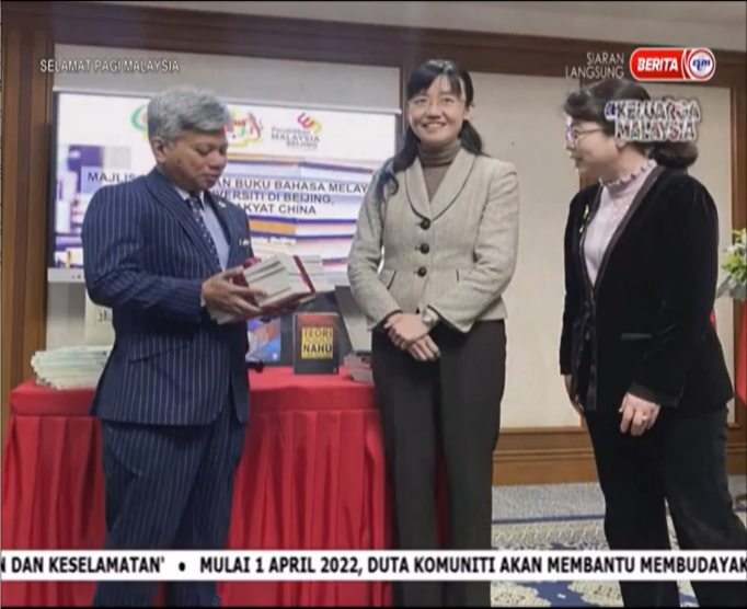 2022年5月24日,开云官网kaiyun开云官方马来语专业向马来西亚首相拿督斯里·伊斯迈尔·沙必里赠送出版教材《马来语讲中国文化》。马来西亚国家语文出版局董事会主席拿督斯里·阿旺·沙利延教授受托在“马来语国际化发展高端研讨会”开幕式上将此书转交给首相。
