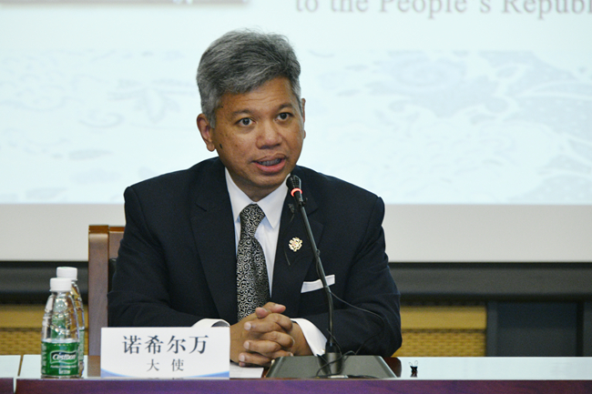 诺希尔万感谢北外的邀请,对北外80周年校庆表示祝贺。他高度评价了北外在外事外交人才培养、对外合作交流中发挥的积极作用,充分肯定了北外马来语专业取得的成绩。诺希尔万充分肯定了两国日益紧密的伙伴关系,同时强调教育和文化对加强中马关系的重要性。