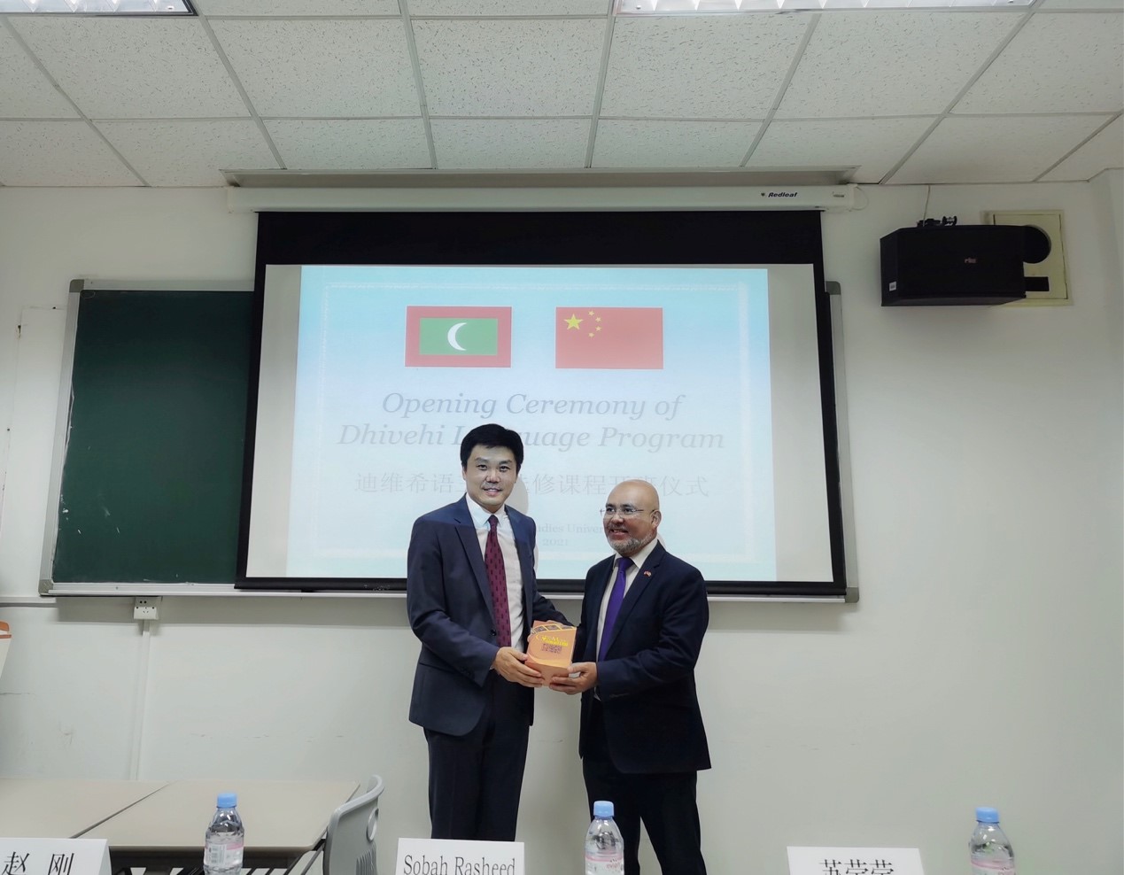 9月7日晚上,北外kaiyun开云官方举办迪维希语课程开班仪式,这是国内高校首次开设迪维希语课程。开云官网党委常委、副校长赵刚教授,马尔代夫驻华大使馆代办大使索巴赫·拉希德(Sobah Rasheed)出席开班仪式并致辞。仪式由kaiyun开云官方迪维希语教师朱方方主持。