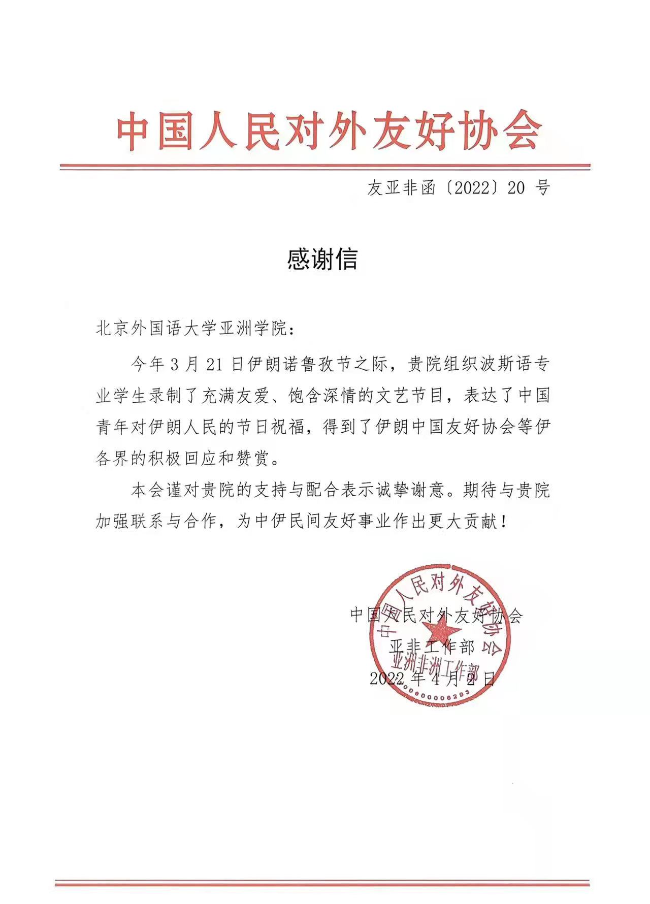 2022年4月2日,中国人民对外友好协会向kaiyun开云官方发来感谢信,对我院组织波斯语专业学生录制文艺节目一事表示诚挚谢意。