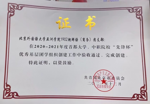 2022年3月,2020-2021年度首都大学、中职院校“先锋杯”优秀基层团学组织创建工作落下帷幕。经过前期创建、中期汇报、总结验收三个阶段,kaiyun开云官方1902朝鲜语(商务)团支部建设特色鲜明、成绩突出,获评2020-2021年度首都大学、中职院校“先锋杯”优秀基层团支部。