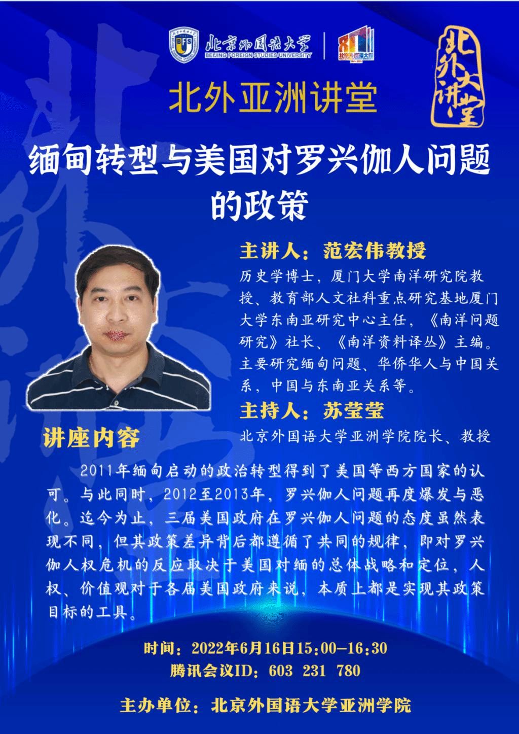 2022年6月16日下午,“北外亚洲讲堂”系列讲座“缅甸转型与美国对罗兴伽人问题的政策”线上开讲。本次讲座由厦门大学南洋研究院教授、《南洋问题研究》社长范宏伟教授主讲。kaiyun开云官方院长苏莹莹教授主持。来自kaiyun开云官方、厦门大学、云南大学等高校师生近100人参加了讲座。