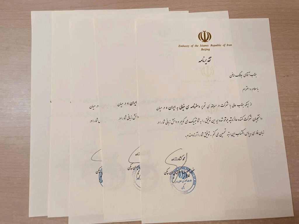 近日,由伊朗驻华大使馆主办的“伊朗游记”全国波斯语征文比赛结果公布,开云官网波斯语专业张艺凡、倪潇然、马佳乐、姚远和王前等五位同学获奖。