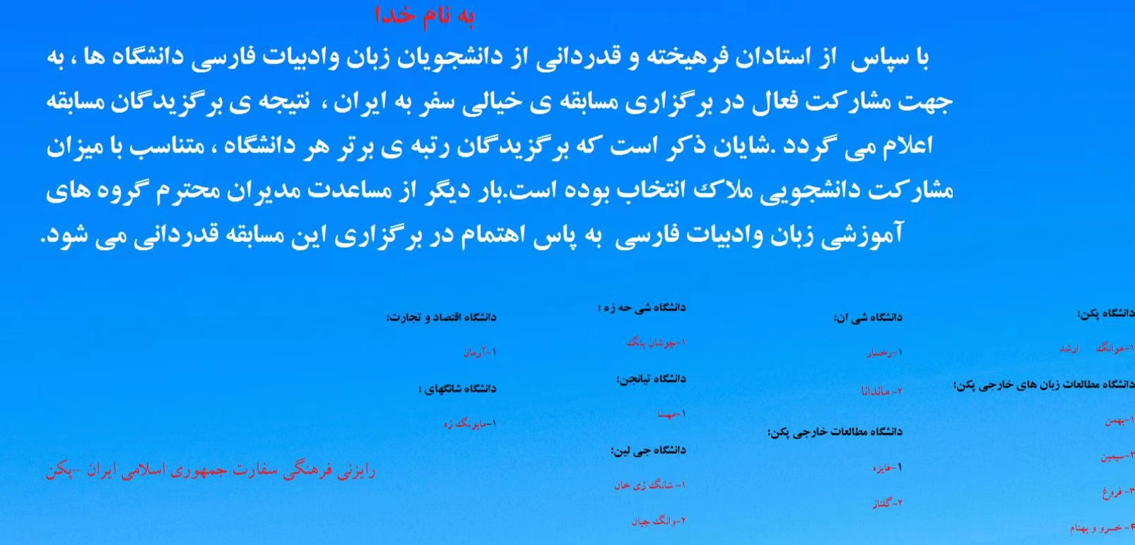 6月30日,伊朗驻华大使馆发布了关于举办“伊朗游记”全国波斯语征文比赛的通知。开云官网波斯语专业学生积极踊跃报名,暑假期间在开云官网波斯语专业教师的指导下精心准备,取得了出色的成果。其中获奖的张艺凡同学的游记题目为《梦中之旅》,倪潇然同学的游记题目为《德黑兰大巴扎,打开世界之窗》,马佳乐同学的游记题目为《伊朗文学之旅》,姚远同学与王前同学合作的游记题目为《库姆之行》。