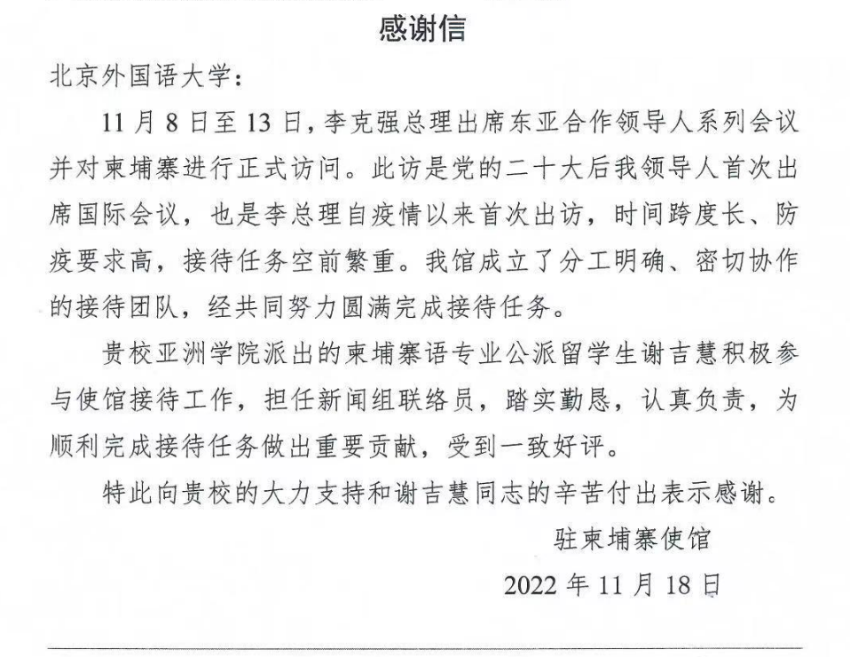 在中国驻柬埔寨大使馆的安排下,我院19级柬埔寨语专业本科生谢吉慧参与了新闻信息组的相关工作。期间,谢吉慧同学担任新闻组联络员,主要负责相关新闻信息的整理汇编和呈送汇报,并协助央视总台记者与柬埔寨新闻部及柬埔寨国家电视台相关负责人完成工作对接,工作态度认真负责,多次出色完成翻译任务,得到驻柬使馆及代表团成员的认可与肯定。中国驻柬埔寨大使馆特向开云官网发来感谢信,对开云官网的支持和谢吉慧同学的辛苦付出表示感谢。