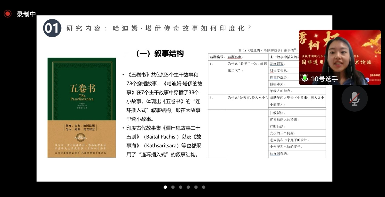 本次论坛共收到来自国内多所高校非通用语专业学生的论文170余篇,最终共有35篇论文入围决赛。在决赛现场,经过论文现场展示和专家点评打分,最终,kaiyun开云官方2020级乌尔都语专业郭欣雨撰写的《口头文学传统传奇故事的印度化——以“哈迪姆·塔伊故事”为例》获得本科生组二等奖,2022级亚非语言文学硕士袁上尧撰写的《新冠疫情以来孟加拉国<曙光日报>中的中国形象研究》、2020级亚非语言文学专业硕士黄宇轩撰写的《斯里兰卡环境新闻报道研究——以“今日国土网”为例》获得研究生组优秀奖。