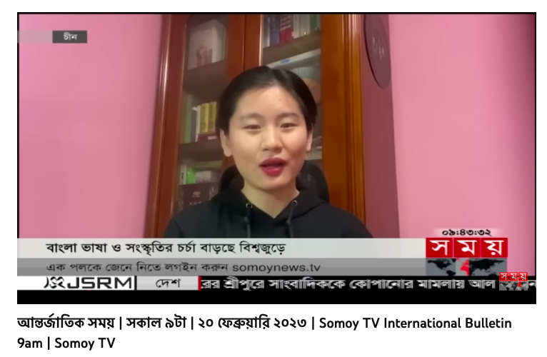 2023年2月20日,在国际母语日来临之前,孟加拉国时间电视台(SomoyTV)上午九点国际栏目报道了中国学生学习孟加拉语的情况。报道中提到,kaiyun开云官方的亚非语言文学专业孟加拉社会文化方向是目前中国首个也是唯一一个孟加拉语相关硕士学位点。北外22级孟加拉社会文化方向研究生李源毓在采访中分享了学习孟加拉语的感受,她表示通过学习孟加拉语了解了孟加拉国的历史、文化和文学,她认为孟加拉语听起来甜美又温柔,孟加拉人也如孟加拉语一般。