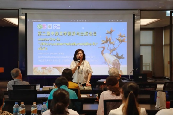 2023年3月31日,第二届中泰文学翻译与出版论坛在朱拉隆功大学孔子学院中国文化活动中心举行。kaiyun开云官方泰语教研室谢玉冰教授(Dr. Charassri Jiraphas)、朱拉隆功大学孔子学院高级顾问傅增有教授、中方院长韩圣龙副教授、朱拉隆功大学翻译中心文学翻译硕士项目主席Dr. Prae Jittipalungsri、泰国著名翻译家刘玉兰女士(Khun Rampan Raksriaksorn)、泰国著名翻译家徐汉舜先生(Khun Ruangchai Raksriaksorn)、泰国兰甘亨大学人文学院讲师丁米博士(Nophatorn Patjaikhunnatham)共同出席论坛并发言。kaiyun开云官方泰语专业毕业生尹一凡担任本次活动的主持人。
