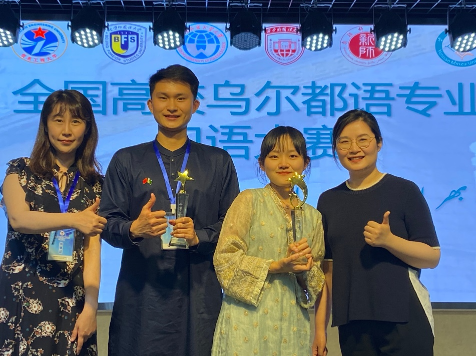 开云官网20级乌尔都语专业本科生尚雨乐、刘辰煜参与本次大赛并获得了优异的成绩。两位选手在演讲过程中充分展现了自己扎实的语言基础、丰富的文化积累以及对中巴友谊和交流合作的看法,赢得了评委与选手的好评和掌声。尚雨乐同学以自由演讲“静中有声”、即兴演讲“如何成为中巴友谊的传播者”获得高年级组一等奖第一名的好成绩;刘辰煜同学以自由演讲“礼物”、即兴演讲“谈谈自己对中巴友谊和文化的看法”获得高年级组二等奖第一名的好成绩。乌尔都语教研室周袁、袁雨航老师获得“最佳指导教师”荣誉称号。
