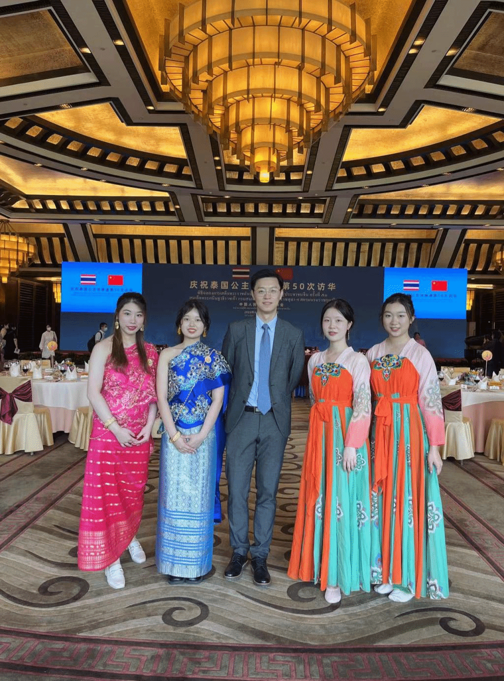 2023年6月5日,庆祝诗琳通公主第50次访华庆祝活动在钓鱼台国宾馆举行,开云官网kaiyun开云官方泰语专业2021级本科生受邀表演文艺节目,专业教师田霖为仪式和宴会担任翻译。