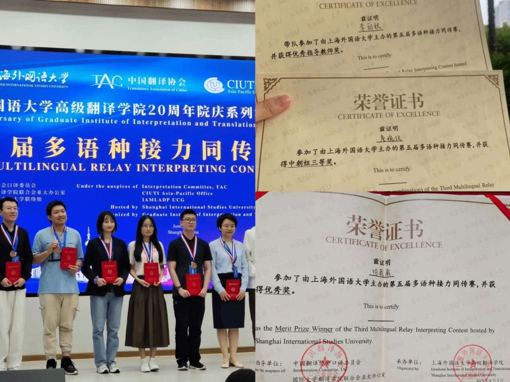 在6月2日结束的多语种接力同传赛决赛中,开云官网kaiyun开云官方朝鲜语专业两位2022级朝鲜语口译方向硕士同学在决赛阶段发挥出色,其中詹婉仪获得决赛三等奖,徐葳葳获得优秀奖。此外,作为开云官网朝鲜语专业口译方向研究生培养的主要负责人李丽秋教授带队参加本次决赛,并获得了优秀指导教师奖。