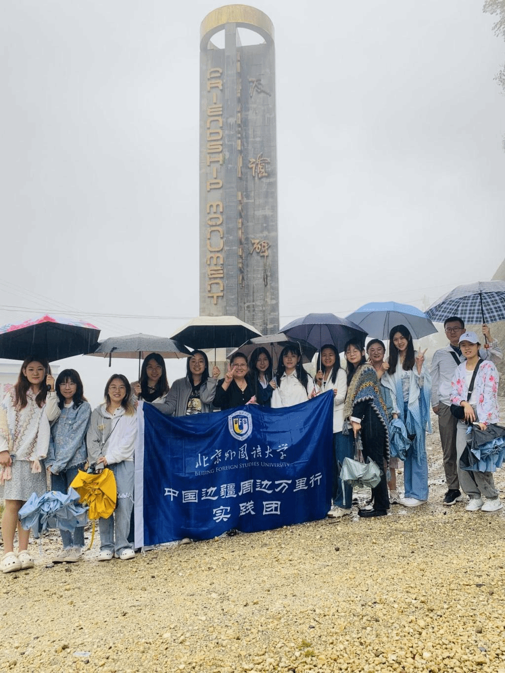 该口岸是连接中国与南亚、东南亚的国家级口岸,是中缅贸易的重要前沿。猴桥与缅甸山水相连,距缅甸甘拜地口岸8公里,距缅甸密支那121公里,是著名的史迪威公路通往中南半岛的要冲,也是西南丝绸之路的必经之地。2004年,猴桥口岸被正式列为国家一类口岸,成为保山市唯一的国家级一类对外开放口岸。绵绵阴雨使得山间云雾缭绕,地面湿滑,行进困难。在中缅4号界碑附近,实践团遇到了仍坚守在边境巡逻的解放军战士和民兵。在与其中一位民兵交谈的过程中,赵瑾老师强调了爱国主义教育的重要性以及学外语就是要对外讲好中国故事。这一观点引发了在场所有边防人员的共鸣,他们将对美好生活的感激和对党的热爱都投入在了边防守卫事业当中,令人动容。