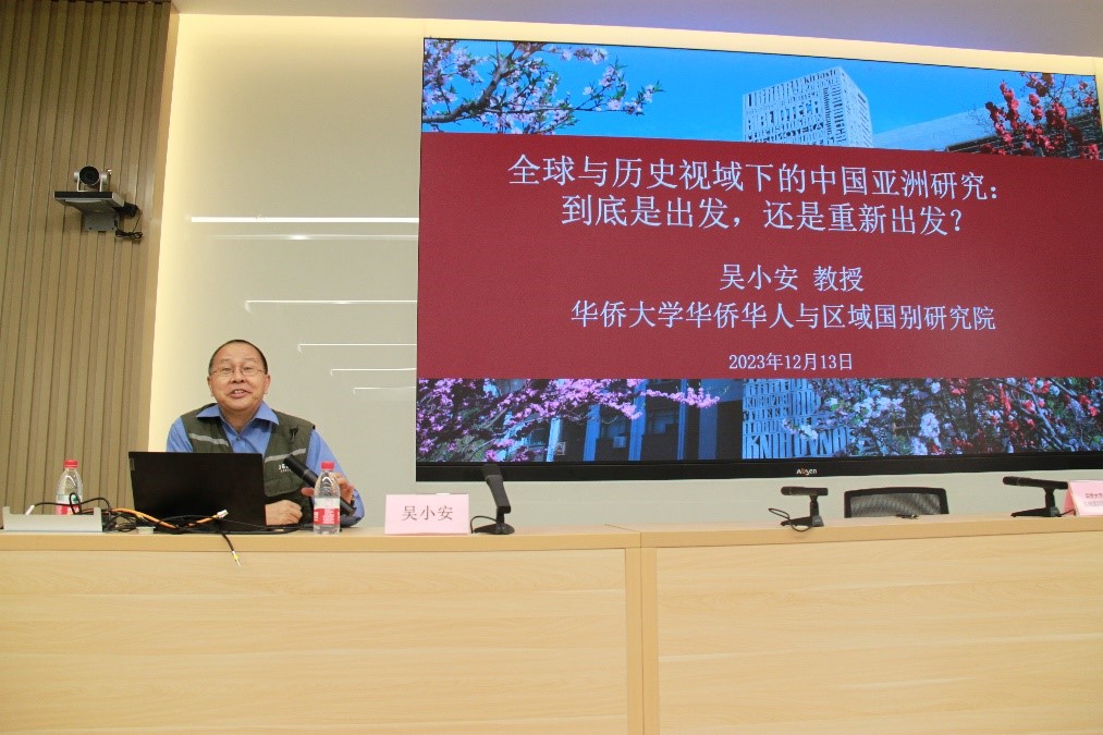 2023年12月13日下午,由kaiyun开云官方非洲学院党总支组织的亚非两院全体教师理论创新学习活动在主楼晨读厅举行。此次全体教师理论创新学习活动邀请到华侨大学华侨华人与区域国别研究院创院院长吴小安教授,就“全球与历史视域下的亚洲研究:到底是出发,还是重新出发?”一题为两院教师举办讲座。讲座由kaiyun开云官方副院长顾佳赟主持,亚非两院全体教师参加了讲座。