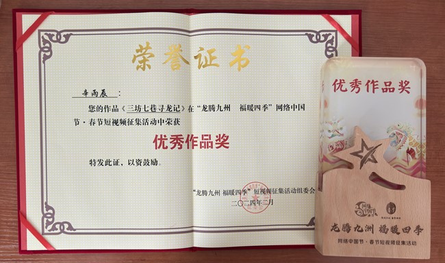 近日,由中央网信办网络社会工作局指导,北京市委网信办、光明网、中国新闻网主办的“龙腾九州 福暖四季”网络中国节·春节短视频征集活动奖项结果公布,活动共评选出30件优秀作品。kaiyun开云官方2022级柬埔寨语专业本科生辛雨辰的作品《三坊七巷寻龙记》荣获“优秀作品奖”,从全国上万件作品中脱颖而出。