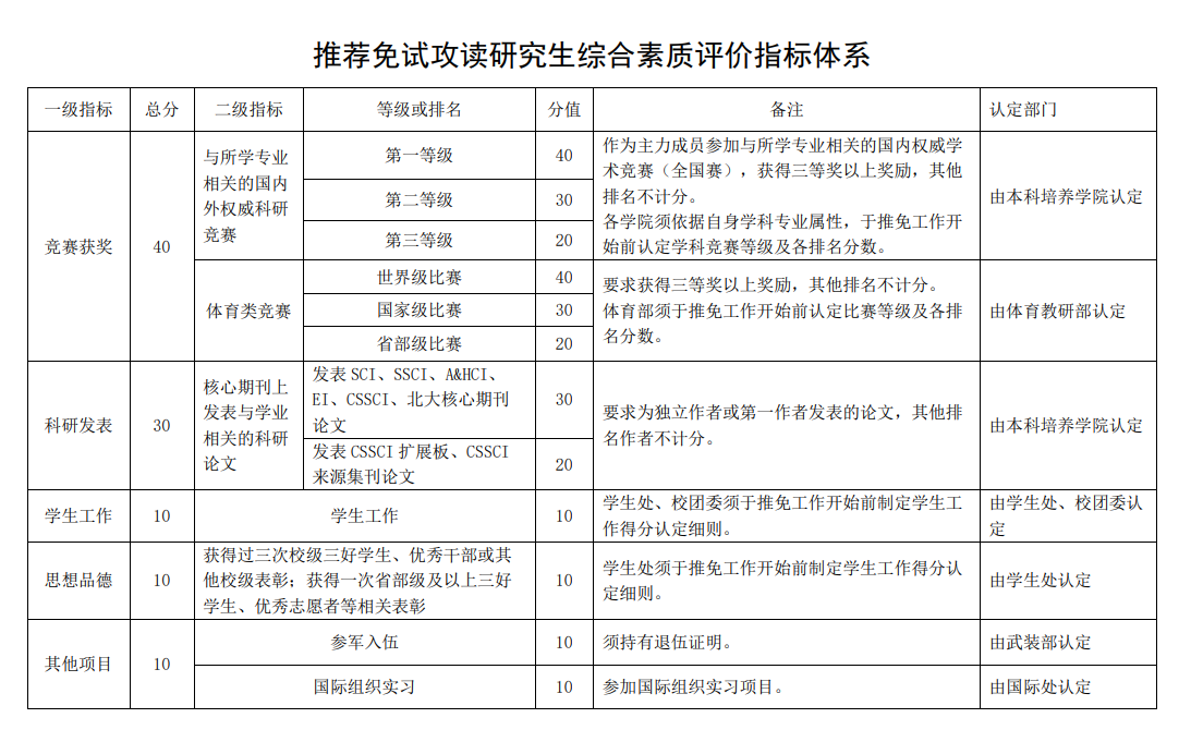 综合素质分为百分制,综合素质评价指标体系详见《推荐免试攻读研究生综合素质评价指标体系》。