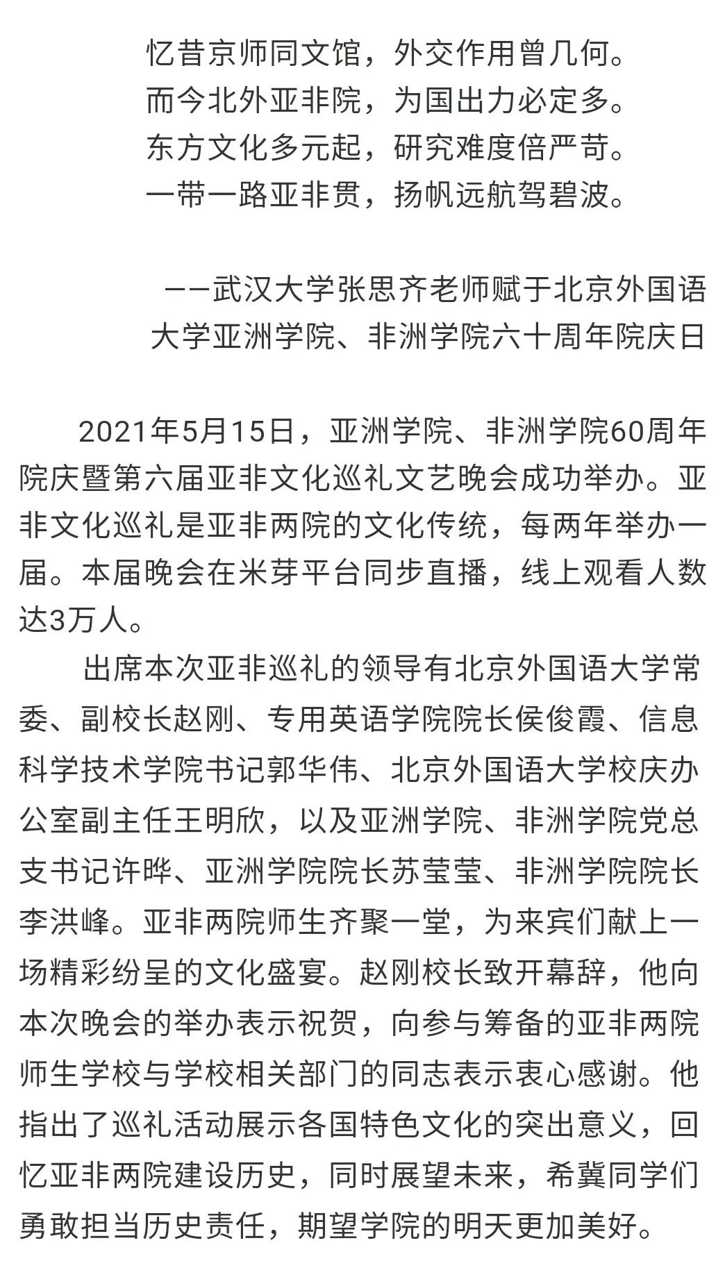 在校舞蹈团充满异域风情的舞蹈表演后,亚非两院师生一同唱响院歌《飞,亚非》。真挚的歌声、相视的笑脸、满场挥舞的各色荧光棒,在回味与感动中,kaiyun开云官方、非洲学院60周年院庆暨第六届亚非文化巡礼晚会圆满落下帷幕。正如院歌里唱到,“飞吧,亚非飞吧,我们永远的家”,这是亚非人共同铸造的永远感动的回忆。至臻之礼,四海无涯,我们在此积蓄活力,扬帆逐梦,带着北外亚非的荣光与使命,向世界,说你好!