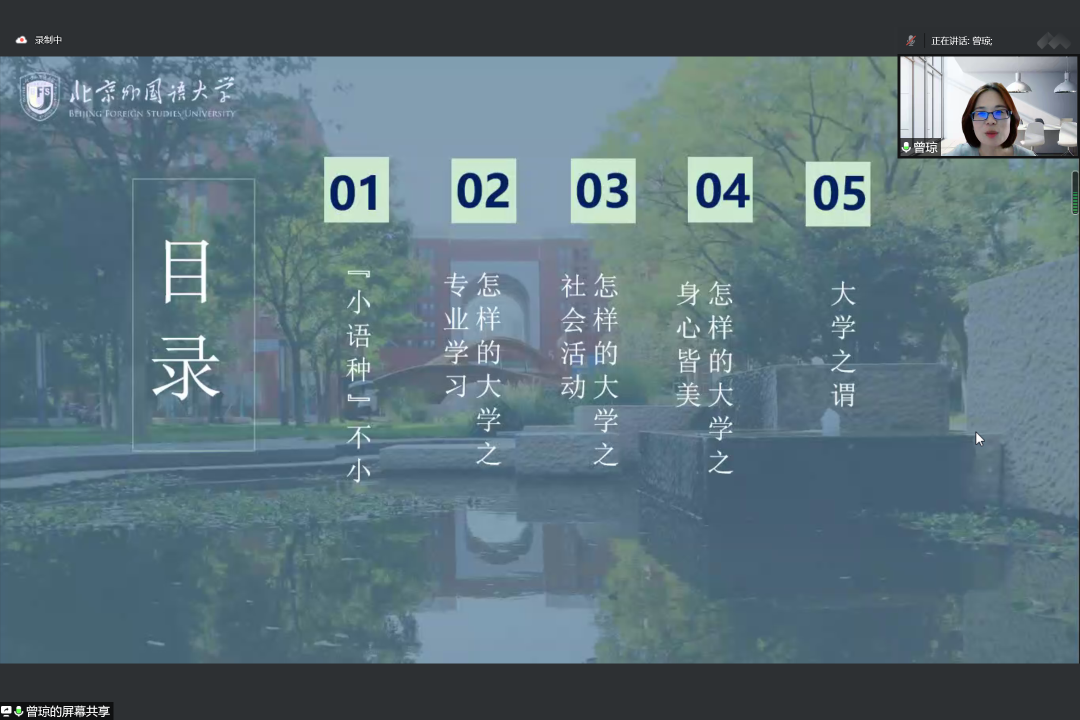 新生入学教育第二讲的主讲人为22级新生辅导员郝雪妮老师。郝老师首先针对“适应新身份”这一主题,结合往届经验为同学们提出了建议;随后,郝老师在学生手册的基础上补充了有关学生工作及日常管理的基本信息,并邀请了辅导员罗云燕老师向新生们传递了学院的殷切期望;在讲话的最后,郝老师为大家带来了BFSUer办事指南及必备清单,详细介绍了身为北外人所应当了解的种种知识,为同学们早日成为“北外通”扫除了障碍。